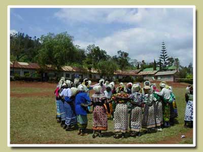 Mzee Shao and his traditional Chagga dancers practicing at Kirimeni Primary School.